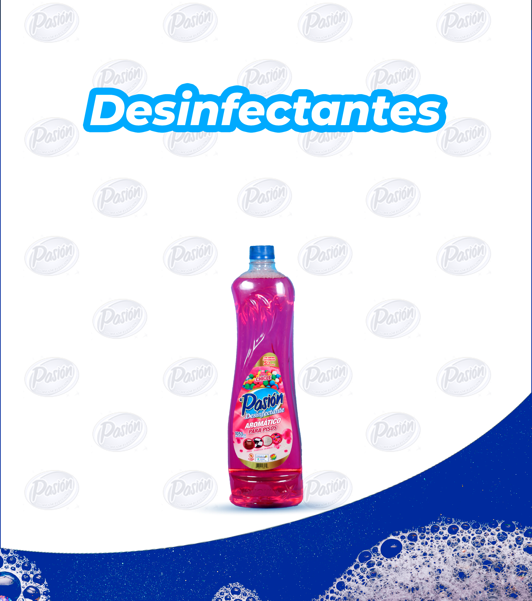 El Desinfectante de piso Pasión aroma chicle está formulado para limpiar, desinfectar y perfumar eficazmente todo tipo de superficies lavables, como pisos, azulejos, baños y áreas comunes. Su fórmula balanceada elimina bacterias, gérmenes y malos olores, dejando un ambiente fresco y agradable gracias a su característico aroma a chicle. Es ideal tanto para el hogar como para uso institucional o comercial.