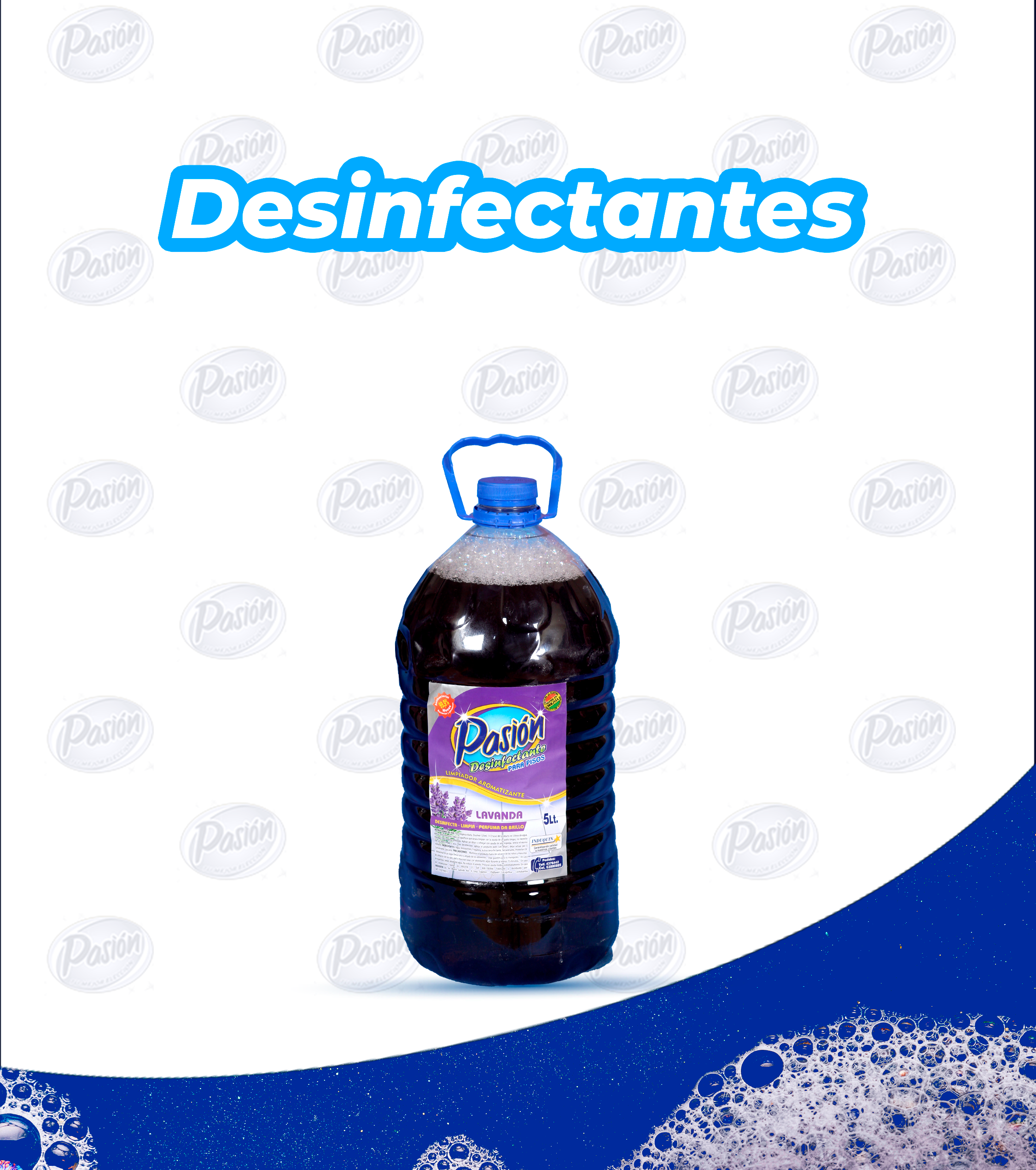 El Desinfectante de piso Pasión aroma lavanda está formulado para limpiar, desinfectar y perfumar eficazmente todo tipo de superficies lavables, como pisos, azulejos, baños y áreas comunes. Su fórmula balanceada elimina bacterias, gérmenes y malos olores, dejando un ambiente fresco y agradable gracias a su característico aroma a lavanda. Es ideal tanto para el hogar como para uso institucional o comercial.