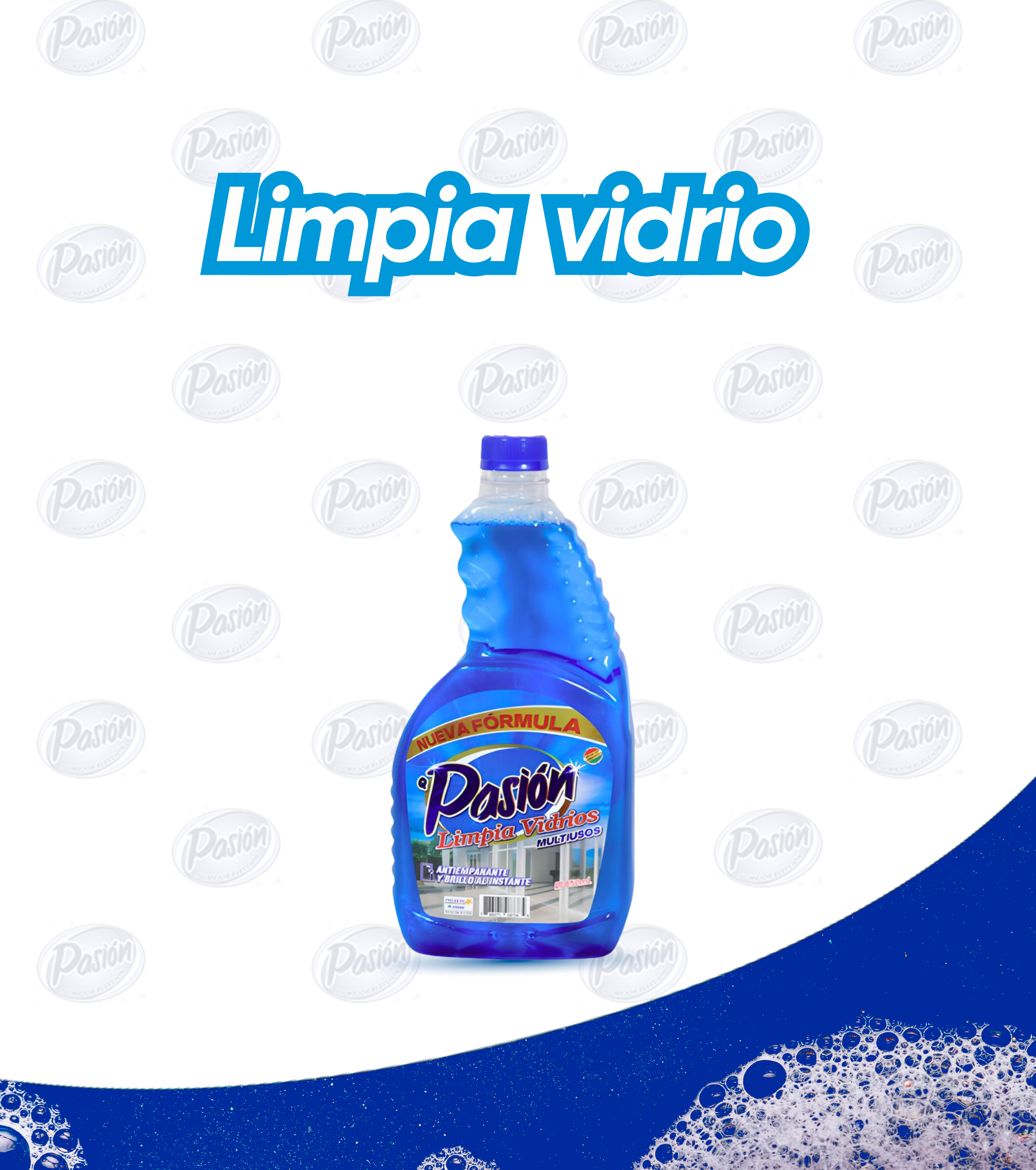 El Limpia Vidrios Pasión es un limpiador líquido especializado para superficies de vidrio, espejos y vitrinas, que ofrece una limpieza brillante, sin dejar marcas ni residuos. Su fórmula de secado rápido y acción antiempañante remueve eficazmente polvo, grasa y huellas, dejando una superficie impecable con un agradable aroma fresco. Ideal para el hogar, oficinas, comercios o vitrinas en puntos de venta, garantiza resultados profesionales con cada aplicación. Se presenta en envase recarga, siendo una excelente alternativa de ahorro.